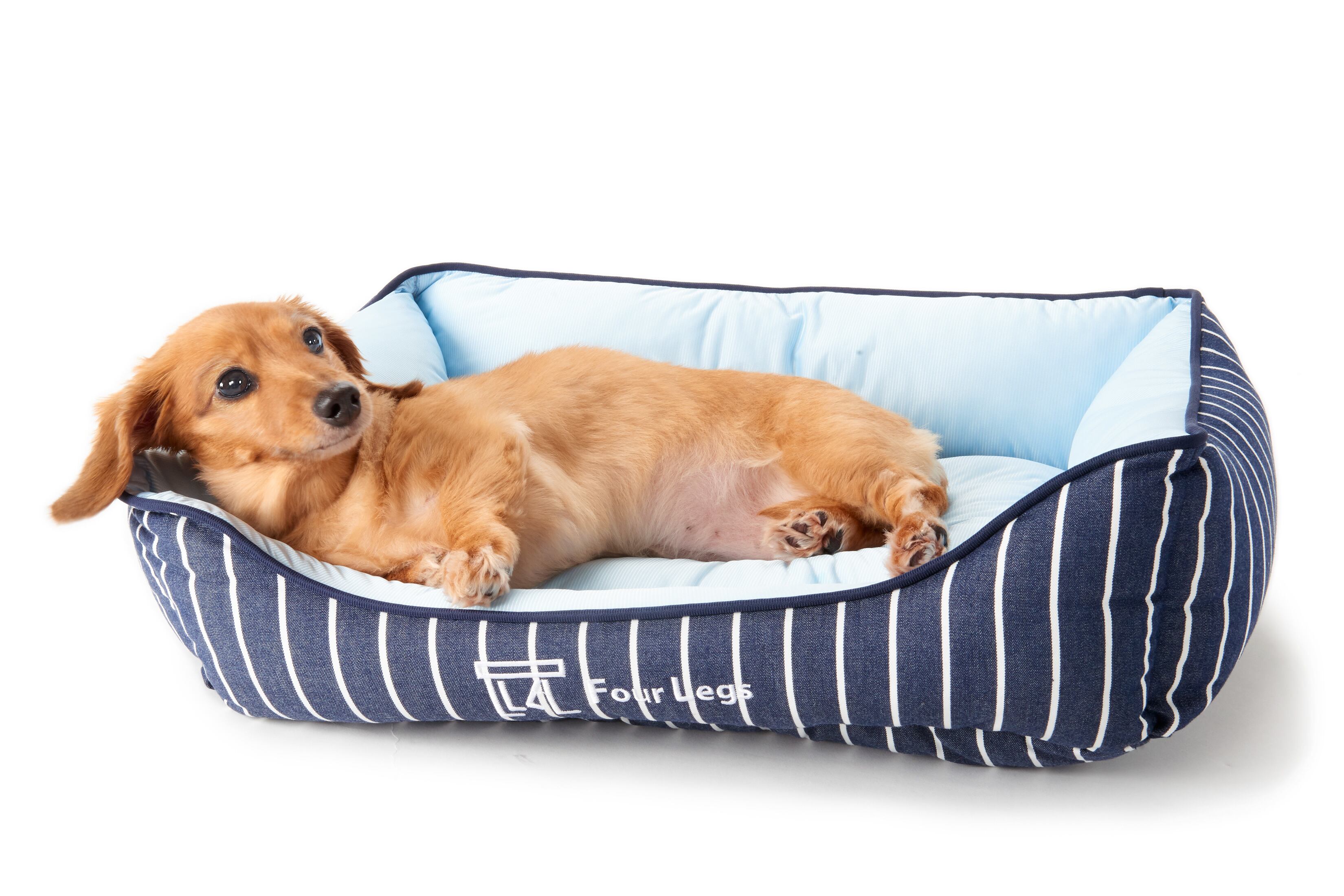 外側生地にはデニムでしっかりした生地にホワイトのストライプをデザインしたベッドです。内側生地には接触冷感生地を使用し寝苦しい梅雨、夏時期でもサラッとした肌触りが気持ちいいベッドになっております。底綿が一体型になったスクエアベッドでひっくり返しても振り回してもクッションが取れることなく、しかもリバーシブル(両面)仕様なので裏返しでも使えて便利なペット用です。Four Legs