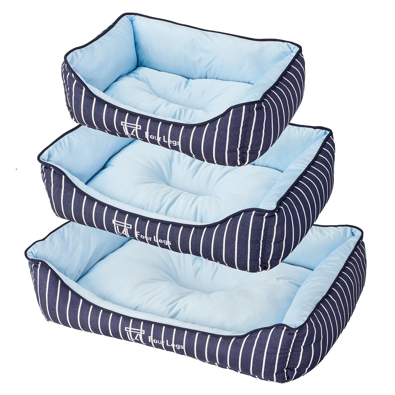 外側生地にはデニムでしっかりした生地にホワイトのストライプをデザインしたベッドです。内側生地には接触冷感生地を使用し寝苦しい梅雨、夏時期でもサラッとした肌触りが気持ちいいベッドになっております。底綿が一体型になったスクエアベッドでひっくり返しても振り回してもクッションが取れることなく、しかもリバーシブル(両面)仕様なので裏返しでも使えて便利なペット用です。Four Legs